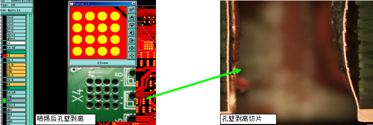 当板厚>2.0mm,孔径>1.0mm,孔距较小的情况下,金属化槽壁及孔壁的铜受热容易剥离,多层板在内层增加连接环,宽度≥8mil可解决此问题,双面板当设计满足可能出现孔铜剥离的情况下建议不做喷锡。