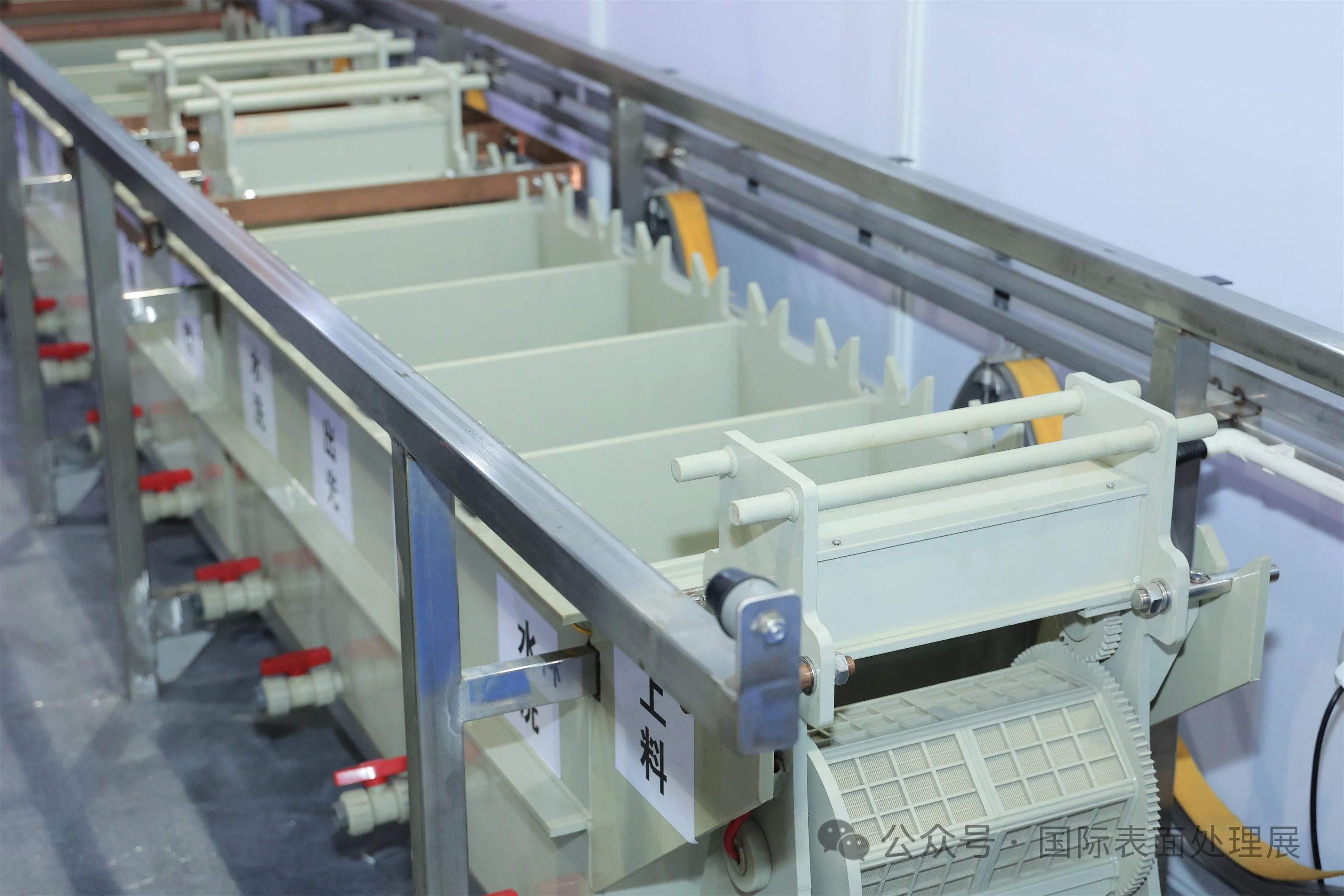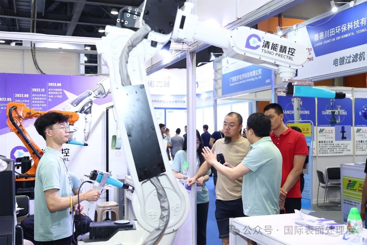 奥邦化工展示电镀光亮剂、电镀中间体、特殊化学品。三川宏带来智能过滤机、电镀过滤机、化工泵等产品。蓝色起源展示BOME系列自然循环MVR蒸发器、BOSE系列刮板结晶干燥器。江苏科滤展示KLNC自然循环、KLFP强制循环系列产品,广东尚辰的“电镀废水零排放”和“钛白粉废水零排放”技术可圈可点,技术成功应用在多个大型园区和世界500强企业的环境生态治理。江门博涂的静电喷粉枪、喷粉房、往复机、供粉中心吸引观众驻足观看。珠海玛斯特的自动转挂系统由六轴机器人替代人工进行挂具/载具转运、浸涂作业。鸿亿展示龙门式滚镀设备、龙门式吊镀设备、油压回转式电镀设备等。